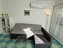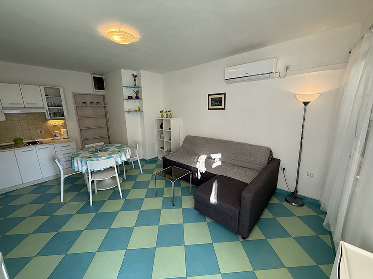 In the indoor space of 40m2 there is a living room with a reclinable sofa allowing for additional sleeping for two people next to the bedroom with a queen-size bed and a dining/kitchen area for a complete holiday experience at the sea.